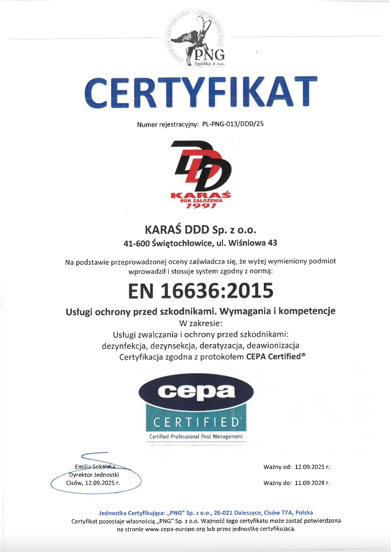 Jakość jest dla nas kluczowa na każdym etapie realizacji usług. W 2022 roku uzyskaliśmy prestiżową certyfikację CEPA EN 16636:2015, potwierdzającą nasze wysokie standardy i profesjonalizm. Wyróżniamy się nie tylko skutecznością, ale także indywidualnym podejściem do każdego klienta, co czyni nas liderem w branży DDD w Polsce. Liczne referencje oraz satysfakcja naszych klientów są najlepszym dowodem na to, że nasza firma to synonim rzetelności, bezpieczeństwa i najwyższej jakości usług.